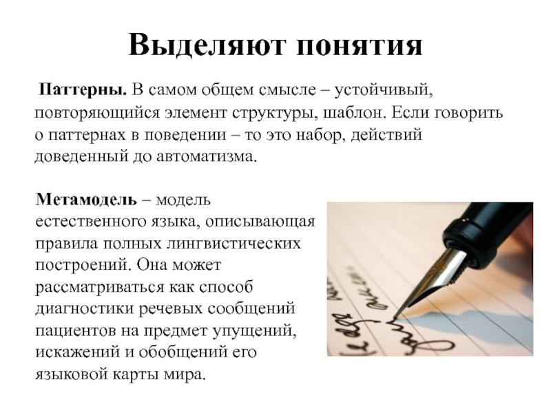 мозг («нейро») путем анализа языковых стереотипов («лингвистическое») и невербальных средств коммуникации. Результаты этого анализа вводятся затем в многоэтапные стратегии или программы («программирование») для передачи данных навыков другим людям и в иные сферы деятельности.