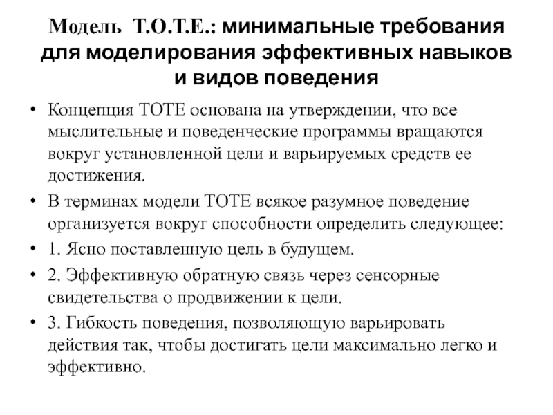 Слайд 15Модель Т.О.Т.Е.: минимальные требования для моделирования эффективных навыков и видов