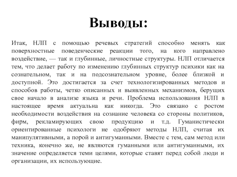 так и глубинные, личностные структуры. НЛП отличается тем, что делает работу по изменению глубинных структур психики как на сознательном, так и на подсознательном уровне, более близкой и доступной. Это достигается за счет технологизированных методов и способов работы, четко описанных и выявленных механизмов, берущих свое начало в анализе языка и речи. Проблема использования НЛП в настоящее время актуальна как никогда. Это связано с ростом необходимости воздействия на сознание человека со стороны политиков, фирм, рекламирующих свою продукцию и т.д. Гуманистически ориентированные психологи не одобряют методы НЛП, считая их манипулятивными, а порой и антигуманными. Вместе с тем, сам метод или техника, конечно же, не являются гуманными или антигуманными, их значение определяется теми целями, которые ставят перед собой люди и организации, их использующие.