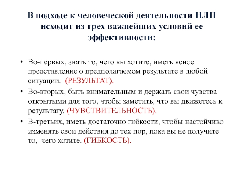 Слайд 17В подходе к человеческой деятельности НЛП исходит из трех важнейших