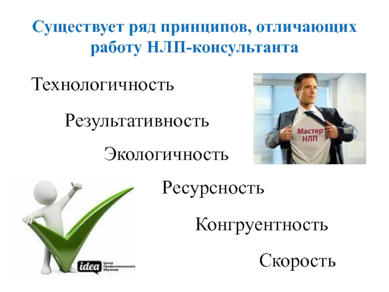 Слайд 19Существует ряд принципов, отличающих работу НЛП-консультанта