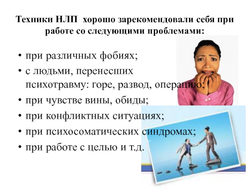 Слайд 20Техники НЛП хорошо зарекомендовали себя при работе со следующими проблемами: