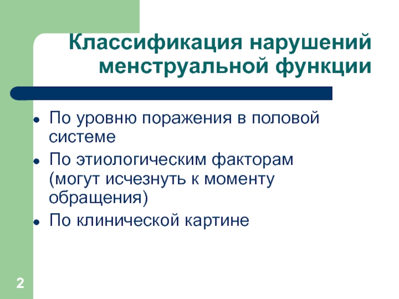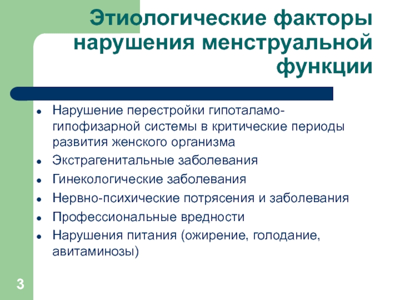 Слайд 3Этиологические факторы нарушения менструальной функции