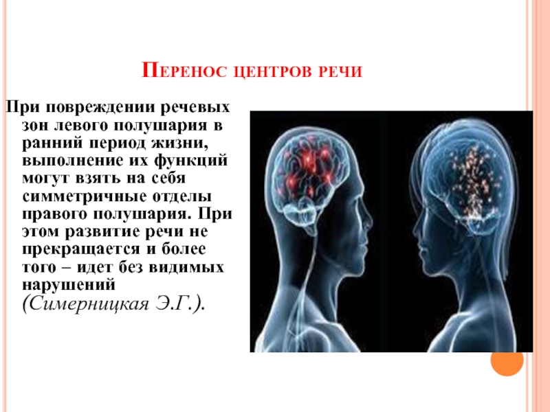 Перенос центров речиПри повреждении речевых зон левого полушария в ранний период жизни, выполнение их функций могут взять