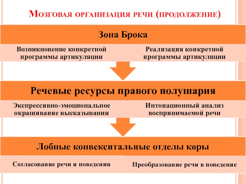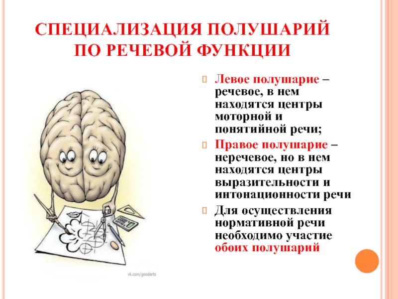 СПЕЦИАЛИЗАЦИЯ ПОЛУШАРИЙ  ПО РЕЧЕВОЙ ФУНКЦИИЛевое полушарие – речевое, в нем находятся центры моторной и понятийной речи;Правое