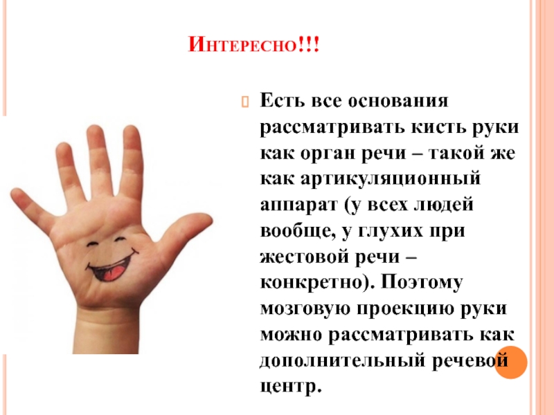 Интересно!!!Есть все основания рассматривать кисть руки как орган речи – такой же как артикуляционный аппарат (у всех