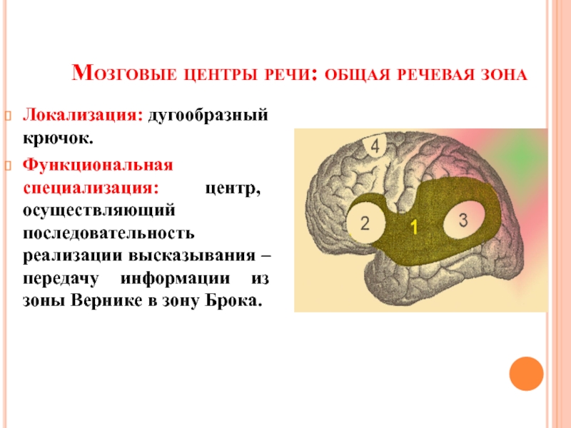 Мозговые центры речи: общая речевая зонаЛокализация: дугообразный крючок.Функциональная специализация: центр, осуществляющий последовательность реализации высказывания – передачу информации