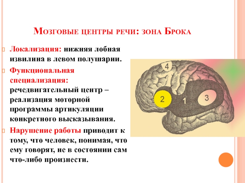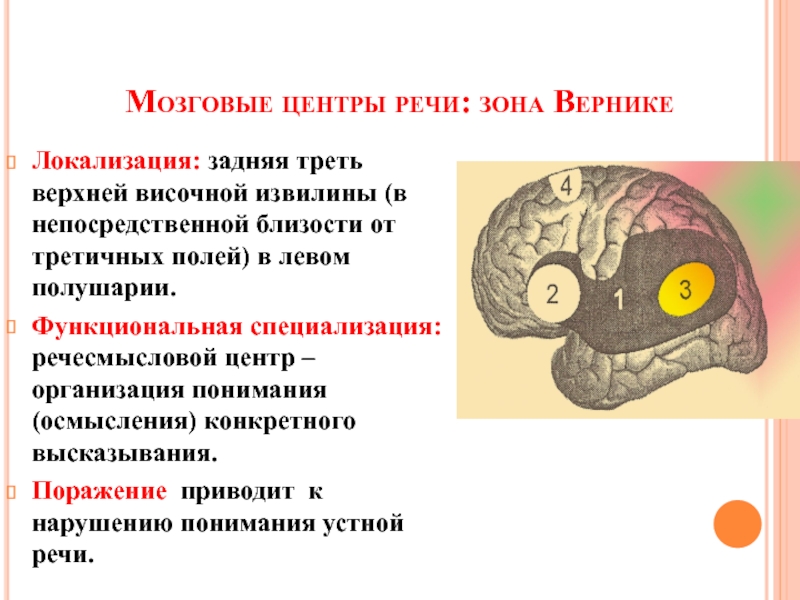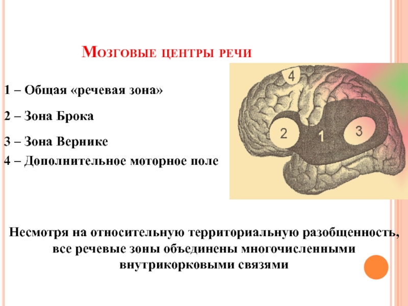 1 – Общая «речевая зона»2 – Зона Брока3 – Зона Вернике4 – Дополнительное моторное полеМозговые центры речиНесмотря