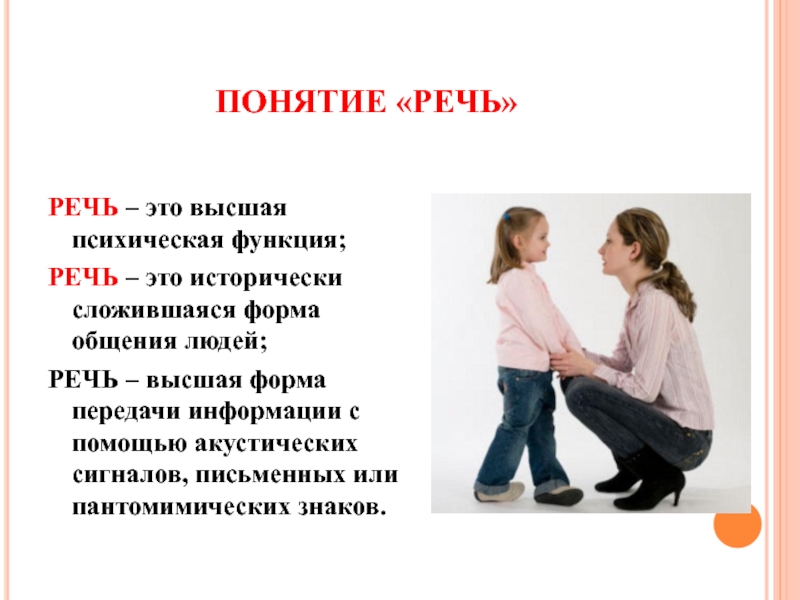 ПОНЯТИЕ «РЕЧЬ»РЕЧЬ – это высшая психическая функция;РЕЧЬ – это исторически сложившаяся форма общения людей;РЕЧЬ – высшая форма передачи информации с помощью акустических сигналов, письменных или пантомимических знаков.