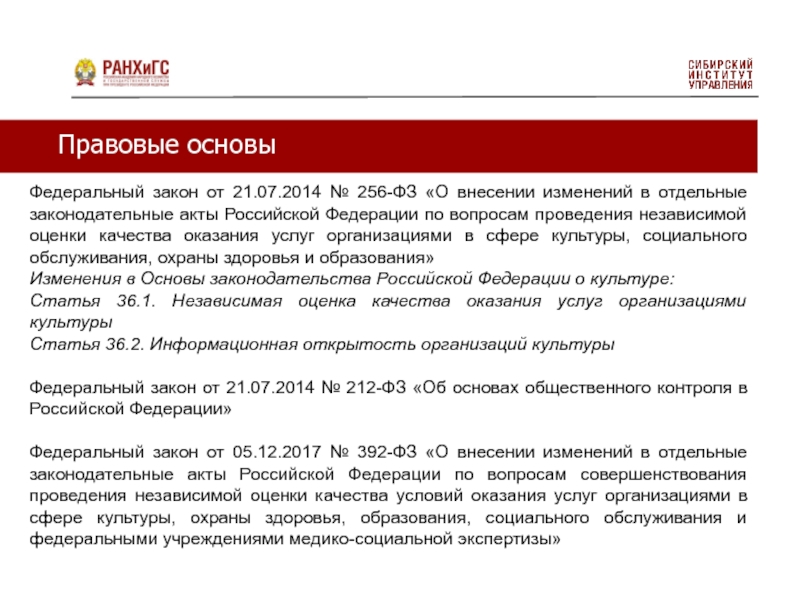 Федеральный закон от 05.12.2017 № 392-ФЗ «О внесении изменений в отдельные законодательные акты Российской Федерации по вопросам совершенствования проведения независимой оценки качества условий оказания услуг организациями в сфере культуры, охраны здоровья, образования, социального обслуживания и федеральными учреждениями медико-социальной экспертизы»