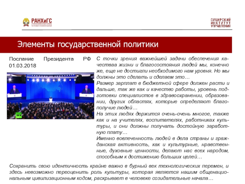 Сохранить свою идентичность крайне важно в бурный век технологических перемен, и здесь невозможно переоценить роль культуры, которая является нашим общенацио-нальным цивилизационным кодом, раскрывает в человеке созидательные начала…