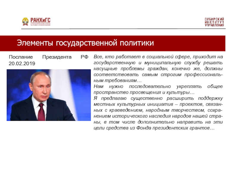 Я предлагаю существенно расширить поддержку местных культурных инициатив – проектов, связан-ных с краеведением, народным творчеством, сохра-нением исторического наследия народов нашей стра-ны, в том числе дополнительно направить на эти цели средства из Фонда президентских грантов…