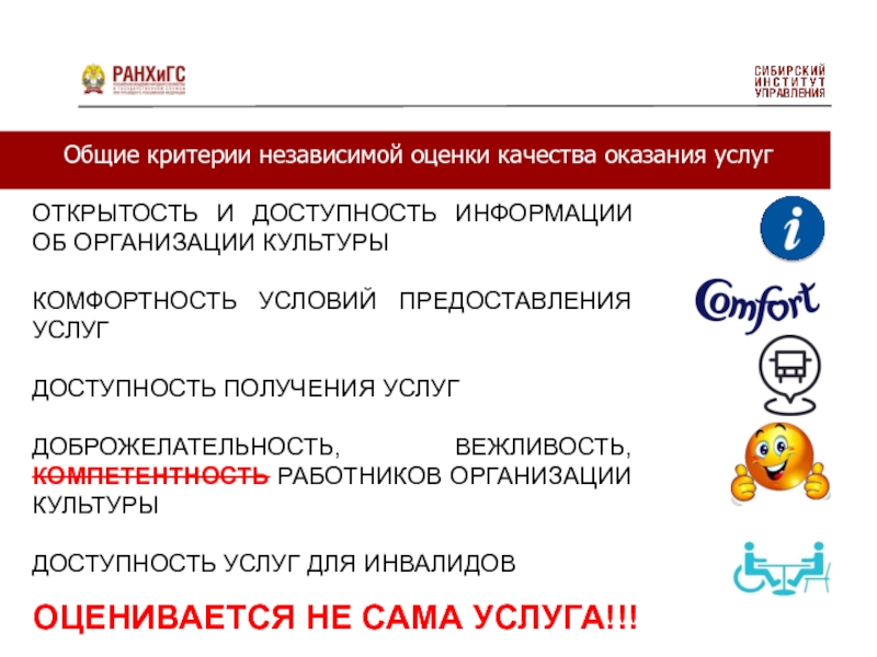 Слайд 15Общие критерии независимой оценки качества оказания услуг