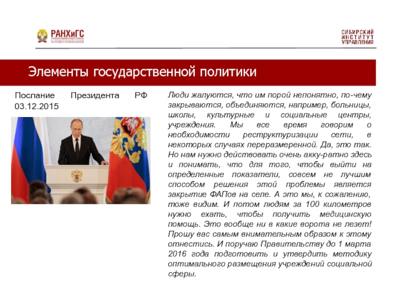 центры, учреждения. Мы все время говорим о необходимости реструктуризации сети, в некоторых случаях переразмеренной. Да, это так. Но нам нужно действовать очень акку-ратно здесь и понимать, что для того, чтобы выйти на определенные показатели, совсем не лучшим способом решения этой проблемы является закрытие ФАПов на селе. А это мы, к сожалению, тоже видим. И потом людям за 100 километров нужно ехать, чтобы получить медицинскую помощь. Это вообще ни в какие ворота не лезет! Прошу вас самым внимательным образом к этому отнестись. И поручаю Правительству до 1 марта 2016 года подготовить и утвердить методику оптимального размещения учреждений социальной сферы.
