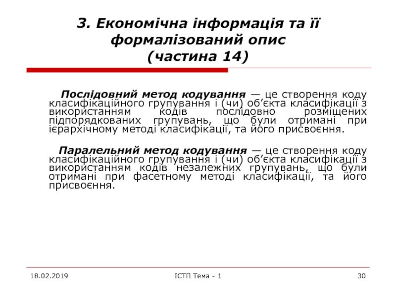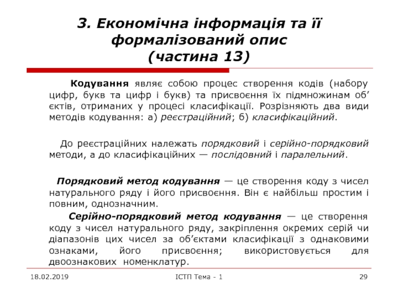 цифр, букв та цифр і букв) та присвоєння їх підмножинам об’єктів, отриманих у процесі класифікації. Розрізняють два види методів кодування: а) реєстраційний; б) класифікаційний.