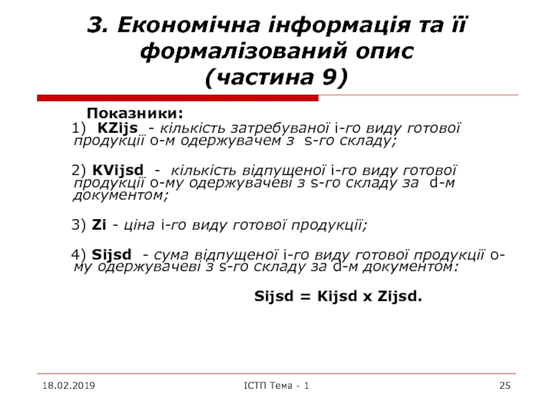 2) KVijsd - кількість відпущеної і-го виду готової продукції o-му одержувачеві з s-го складу за d-м документом;