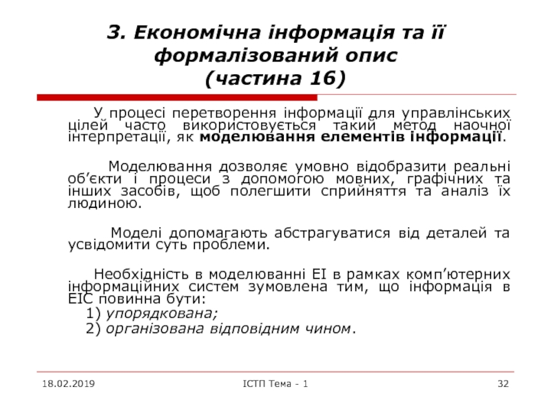 Необхідність в моделюванні ЕІ в рамках комп’ютерних інформаційних систем зумовлена тим, що інформація в ЕІС повинна бути: