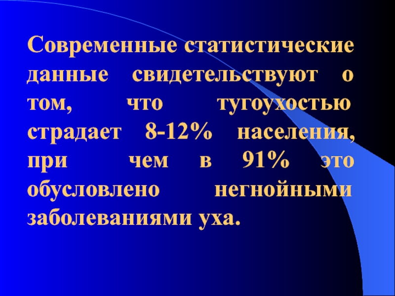Слайд 2Современные статистические данные свидетельствуют о том, что тугоухостью страдает 8-12%