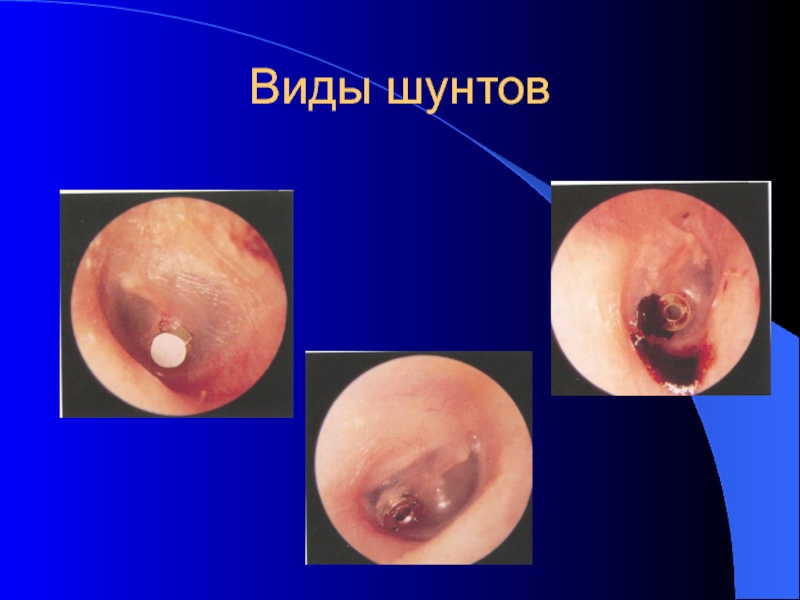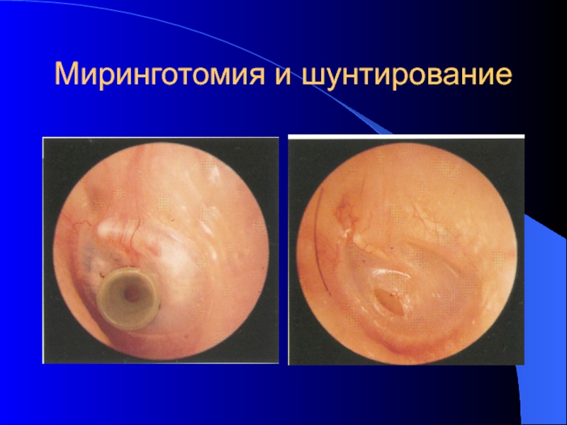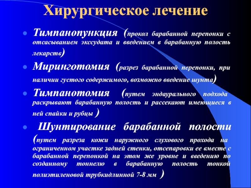 Шунтирование барабанной полости (путем разреза кожи наружного слухового прохода на ограниченном участке задней стенки, отсепаровки ее вместе с барабанной перепонкой на этом же уровне и введению по созданному тоннелю в барабанную полость тонкой полиэтиленовой трубкидлинной 7-8 мм )
