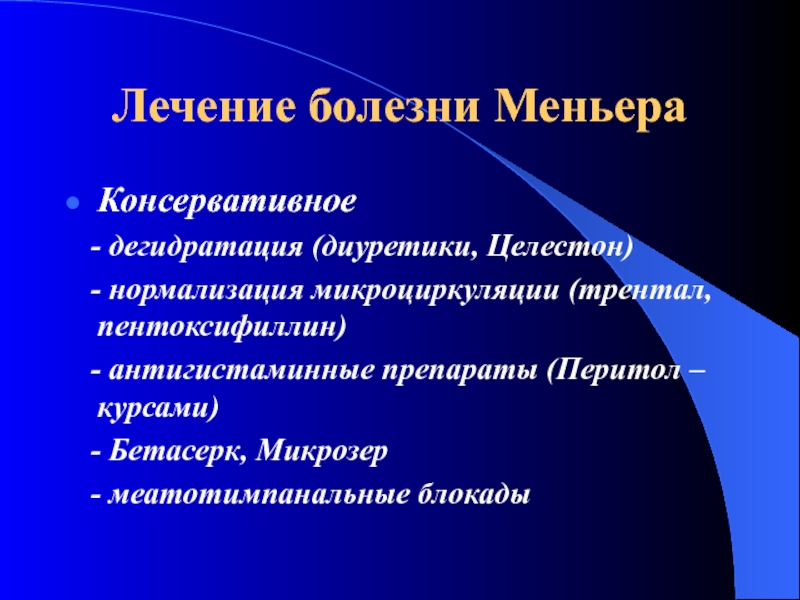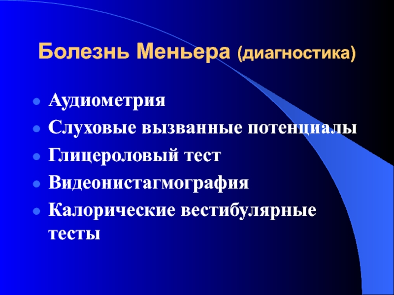 Слайд 24Болезнь Меньера (гидропс лабиринта)