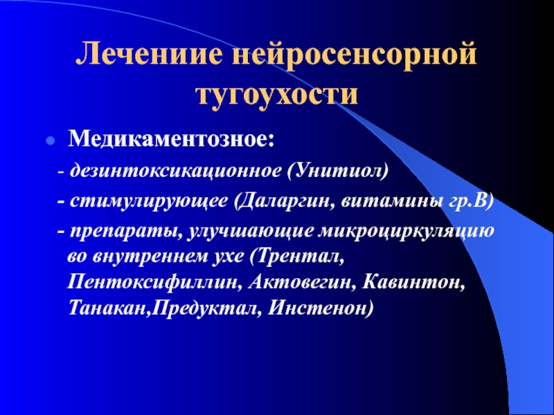 - препараты, улучшающие микроциркуляцию во внутреннем ухе (Трентал, Пентоксифиллин,