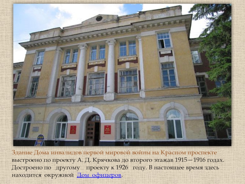 Слайд 24Здание Дома инвалидов первой мировой войны на Красном проспекте выстроено