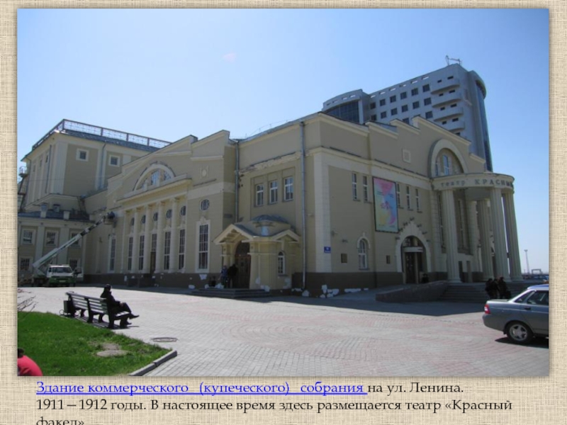 Здание коммерческого   (купеческого)   собрания на ул. Ленина. 1911—1912 годы. В настоящее время здесь размещается театр «Красный факел».