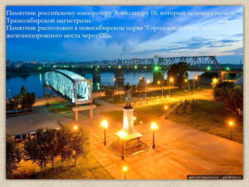 Памятник российскому императору Александру III, который положил начало Транссибирской магистрали.  Памятник расположен в новосибирском парке