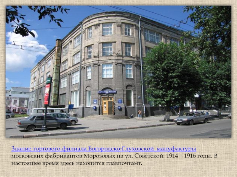 Здание торгового филиала Богородско-Глуховской  мануфактуры московских фабрикантов Морозовых на ул. Советской. 1914—1916 годы. В настоящее время здесь