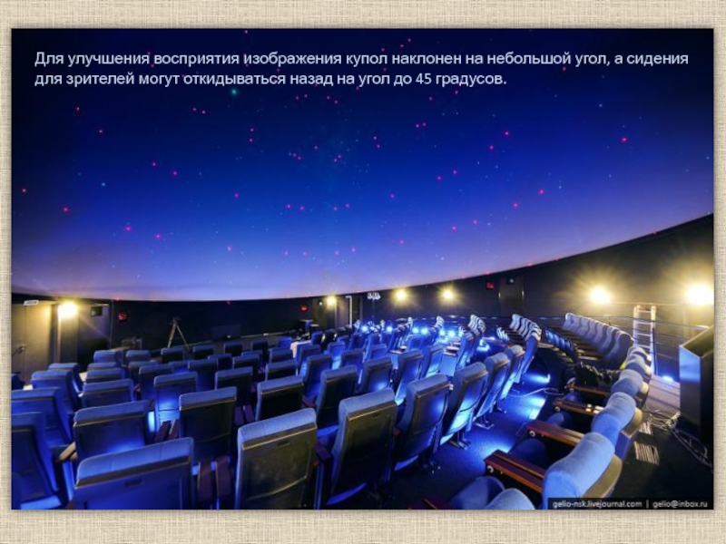 Для улучшения восприятия изображения купол наклонен на небольшой угол, а сидения для зрителей могут откидываться назад на