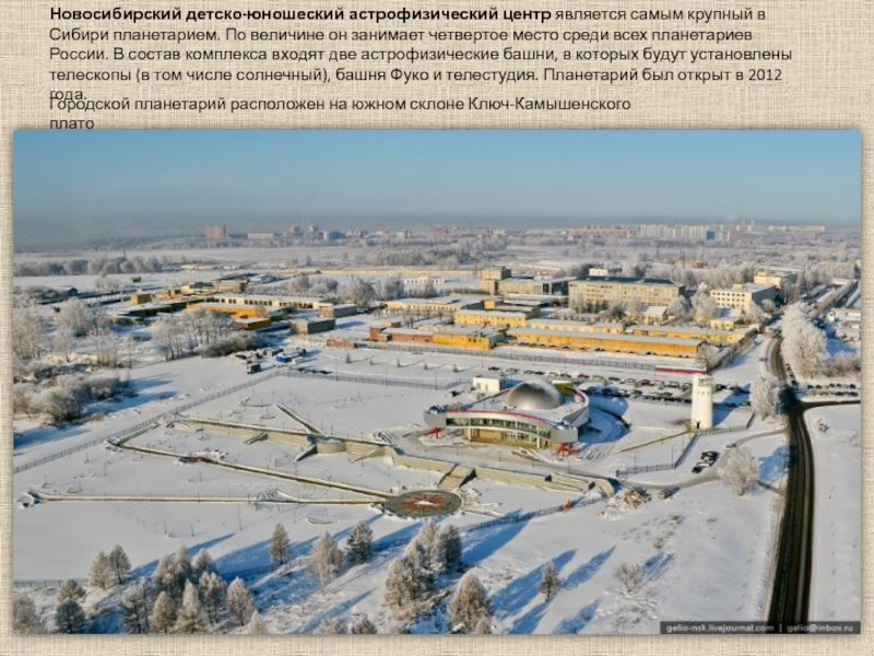 Городской планетарий расположен на южном склоне Ключ-Камышенского платоНовосибирский детско-юношеский астрофизический центр является самым крупный в Сибири планетарием.