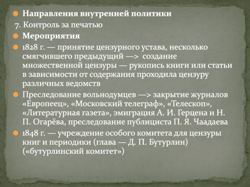 Преследование вольнодумцев —> закрытие журналов «Европеец», «Московский телеграф», «Телескоп», «Литературная газета», эмиграция А. И. Герцена и Н. П. Огарёва, преследование публициста П. Я. Чаадаева