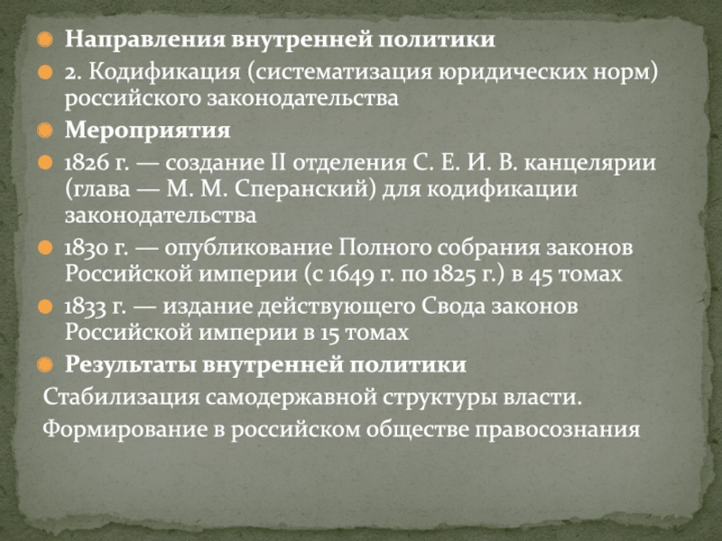 1830 г. — опубликование Полного собрания законов Российской империи (с 1649 г. по 1825 г.) в 45 томах