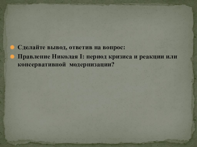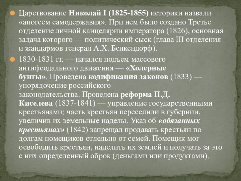 1830-1831 гг. — начался подъем массового антифеодального движения — «Холерные бунты». Проведена кодификация законов (1833) — упорядочение российского законодательства. Проведена реформа П.Д. Киселева (1837-1841) — управление государственными крестьянами: часть крестьян переселили в губернии, увеличив их земельные наделы. Указ об «обязанных крестьянах» (1842) запрещал продавать крестьян по долгам помещиков отдельно от семей. Помещик мог освободить крестьян, наделить их землей и получать за это с них определенный оброк (деньгами или продуктами).