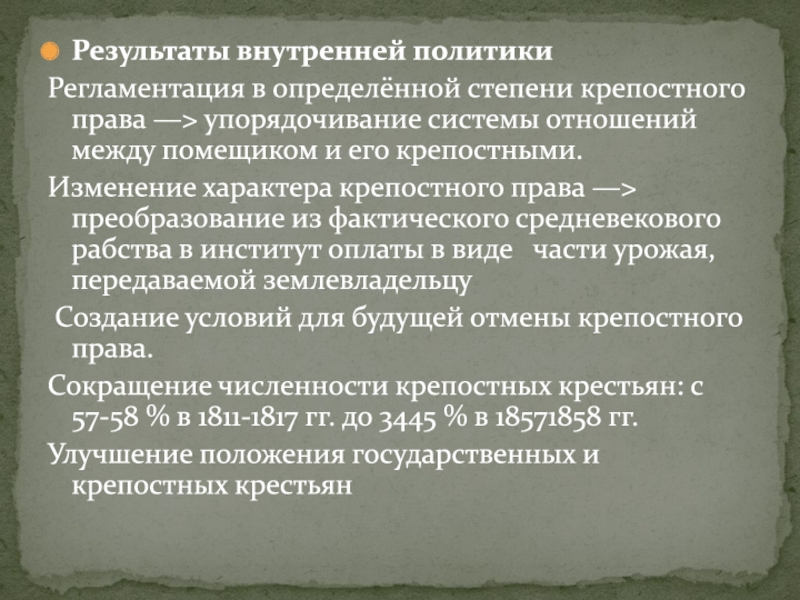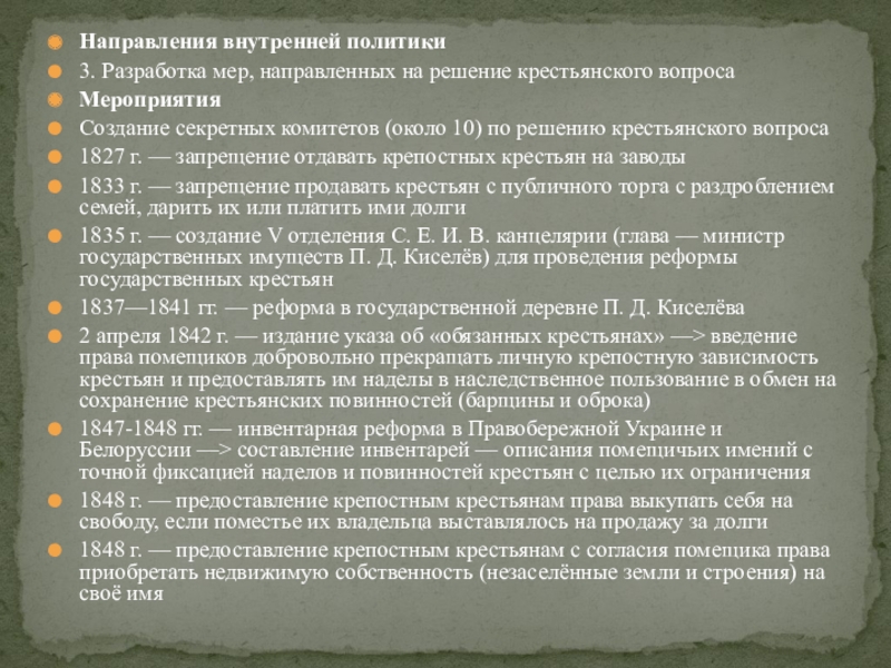 1848 г. — предоставление крепостным крестьянам с согласия помещика права приобретать недвижимую собственность (незаселённые земли и строения) на своё имя