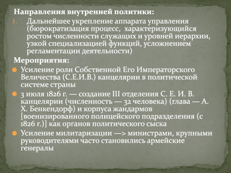 3 июля 1826 г. — создание III отделения С. Е. И. В. канцелярии (численность — 32 человека) (глава — А. X. Бенкендорф) и корпуса жандармов [военизированного полицейского подразделения (с 1826 г.)] как органов политического сыска