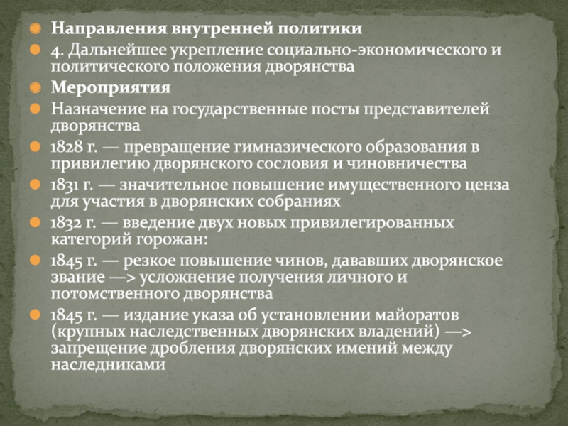 1845 г. — издание указа об установлении майоратов (крупных наследственных дворянских владений) —> запрещение дробления дворянских имений между наследниками