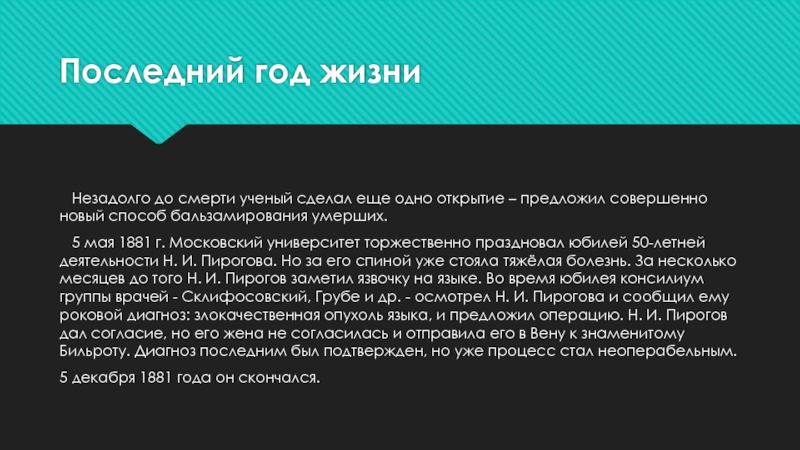 5 мая 1881 г. Московский университет торжественно праздновал юбилей 50-летней деятельности Н. И. Пирогова. Но за его спиной уже стояла тяжёлая болезнь. За несколько месяцев до того Н. И. Пирогов заметил язвочку на языке. Во время юбилея консилиум группы врачей - Склифосовский, Грубе и др. - осмотрел Н. И. Пирогова и сообщил ему роковой диагноз: злокачественная опухоль языка, и предложил операцию. Н. И. Пирогов дал согласие, но его жена не согласилась и отправила его в Вену к знаменитому Бильроту. Диагноз последним был подтвержден, но уже процесс стал неоперабельным.