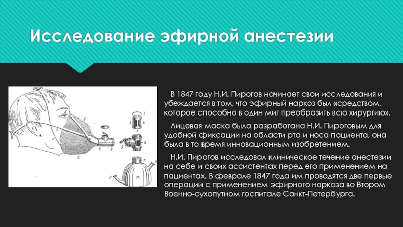 Н.И. Пирогов исследовал клиническое течение анестезии на себе и своих ассистентах перед его применением на пациентах. В феврале 1847 года им проводятся две первые операции с применением эфирного наркоза во Втором Военно-сухопутном госпитале Санкт-Петербурга.