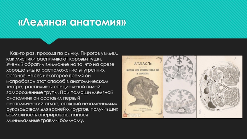 что на срезе хорошо видно расположение внутренних органов. Через некоторое время он испробовал этот способ в анатомическом театре, распиливая специальной пилой замороженные трупы. При помощи «ледяной анатомии» он составил первый анатомический атлас, ставший незаменимым руководством для врачей-хирургов, получивших возможность оперировать, нанося минимальные травмы больному.