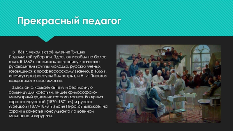 Здесь он открывает аптеку и бесплатную больницу для крестьян, пишет философско-мемуарный «Дневник старого врача». Во время франко-прусской (1870–1871 гг.) и русско-турецкой (1877–1878 гг.) войн Пирогов выезжает на фронт в качестве консультанта по военной медицине и хирургии.