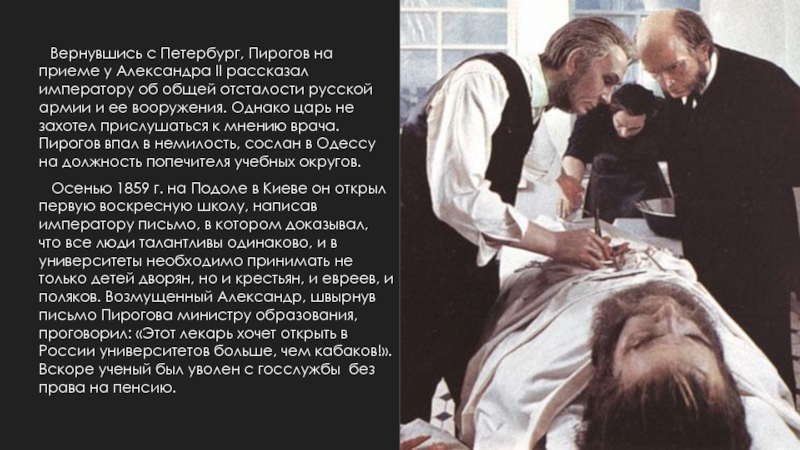 Осенью 1859 г. на Подоле в Киеве он открыл первую воскресную школу, написав императору письмо, в котором доказывал, что все люди талантливы одинаково, и в университеты необходимо принимать не только детей дворян, но и крестьян, и евреев, и поляков. Возмущенный Александр, швырнув письмо Пирогова министру образования, проговорил: «Этот лекарь хочет открыть в России университетов больше, чем кабаков!». Вскоре ученый был уволен с госслужбы без права на пенсию.