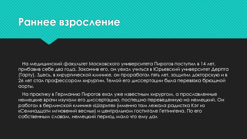 На практику в Германию Пирогов ехал уже известным хирургом, а прославленные немецкие врачи изучали его диссертацию, поспешно переведенную на немецкий. Он работал в берлинской клинике «Шарите» (именно там лежала радистка Кэт из «Семнадцати мгновений весны») и центральном госпитале Геттингена. По его собственным словам, немецкий период мало что ему дал