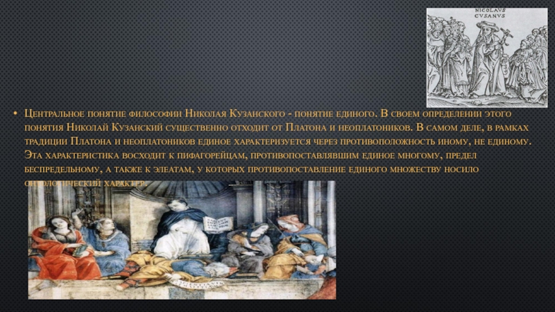 Слайд 4Центральное понятие философии Николая Кузанского - понятие единого. В своем