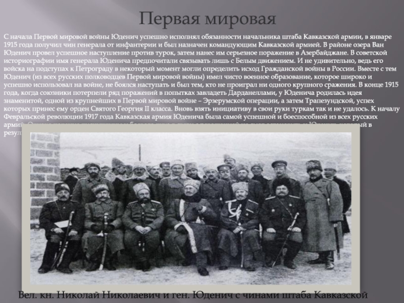 генерала от инфантерии и был назначен командующим Кавказской армией. В районе озера Ван Юденич провел успешное наступление против турок, затем нанес им серьезное поражение в Азербайджане. В советской историографии имя генерала Юденича предпочитали связывать лишь с Белым движением. И не удивительно, ведь его войска на подступах к Петрограду в некоторый момент могли определить исход Гражданской войны в России. Вместе с тем Юденич (из всех русских полководцев Первой мировой войны) имел чисто военное образование, которое широко и успешно использовал на войне, не боялся наступать и был тем, кто не проиграл ни одного крупного сражения. В конце 1915 года, когда союзники потерпели ряд поражений в попытках завладеть Дарданеллами, у Юденича родилась идея знаменитой, одной из крупнейших в Первой мировой войне – Эрзерумской операции, а затем Трапезундской, успех которых принес ему орден Святого Георгия II класса. Вновь взять инициативу в свои руки туркам так и не удалось. К началу Февральской революции 1917 года Кавказская армия Юденича была самой успешной и боеспособной из всех русских армий. Однако падение дисциплины и боевого духа в связи с революцией не смог остановить и Юденич, который в результате встал в жесткую оппозицию Временному правительству. Юденича сняли с поста командующего.