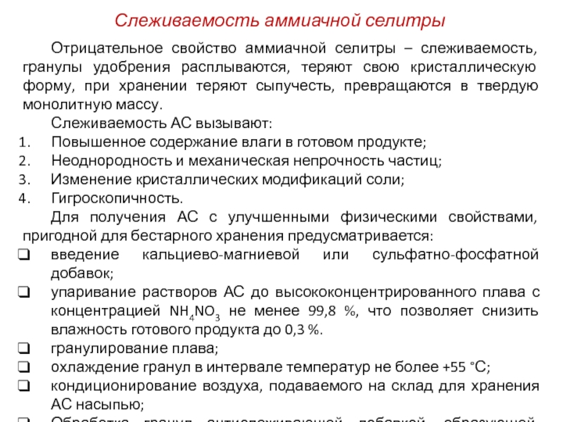Добавление в плав АС растворенных неорганических солей понижает гигроскопическую точку. Введение 1,2 % нитрата магния понижает гигроскопическую точку на 8 - 12 %, при 25 С до 57,3 %, скорость поглощения влаги при этом увеличивается.