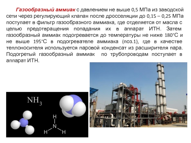Слайд 17Газообразный аммиак с давлением не выше 0,5 МПа из заводской