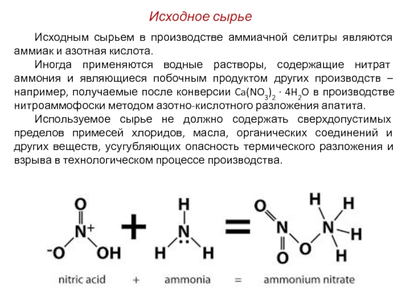 Слайд 16Исходным сырьем в производстве аммиачной селитры являются аммиак и азотная