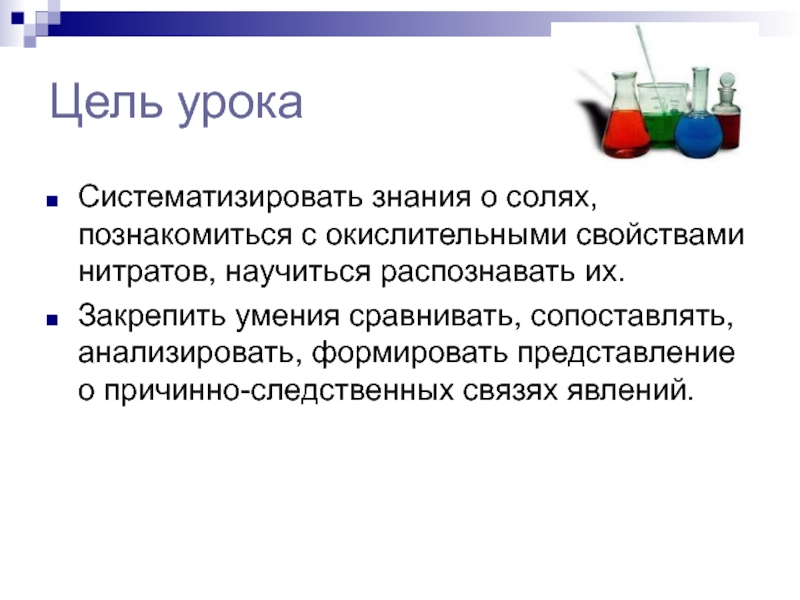Систематизировать знания о солях, познакомиться с окислительными свойствами нитратов,