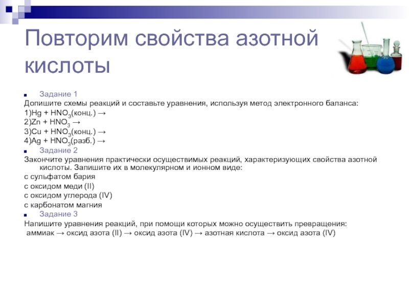 Закончите уравнения практически осуществимых реакций, характеризующих свойства азотной кислоты. Запишите их в молекулярном и ионном виде: